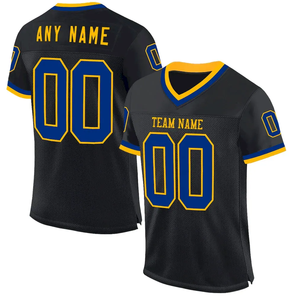 Be the first to review “Custom Black Royal-Gold Mesh Authentic Throwback Football Jersey” Cancel reply
