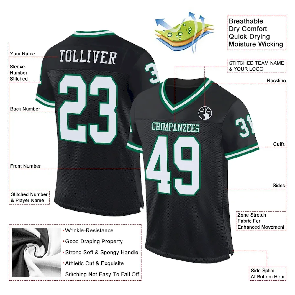 Be the first to review “Custom Black White-Kelly Green Mesh Authentic Throwback Football Jersey” Cancel reply