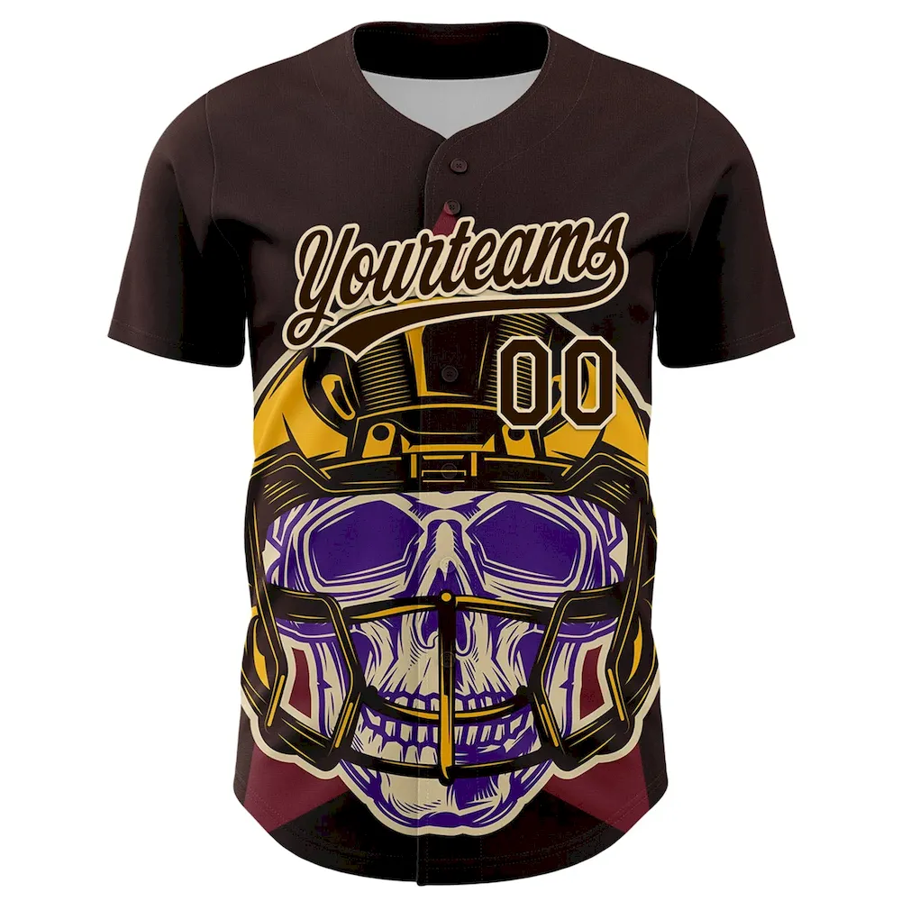 Custom Brown Cream 3D Pattern Design Football Skull Helmet Authentic Baseball Jersey