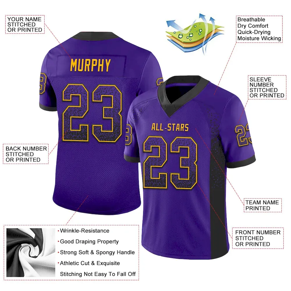 Be the first to review “Custom Purple Black-Gold Mesh Drift Fashion Football Jersey” Cancel reply