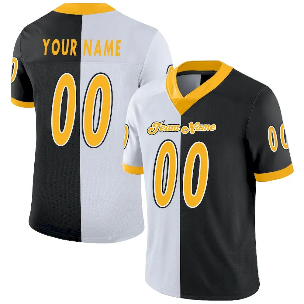Be the first to review “Custom Black Gold-White Mesh Split Fashion Football Jersey” Cancel reply