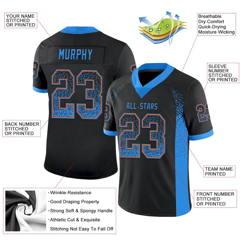 Custom Black Powder Blue-Orange Mesh Drift Fashion Football Jersey