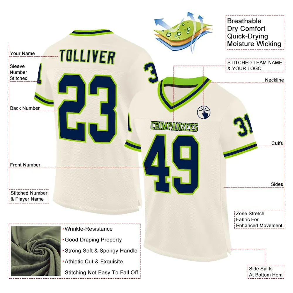 Custom Cream Navy-Neon Green Mesh Authentic Throwback Football Jersey
