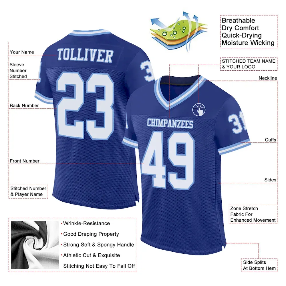 Be the first to review “Custom Royal White-Light Blue Mesh Authentic Throwback Football Jersey” Cancel reply