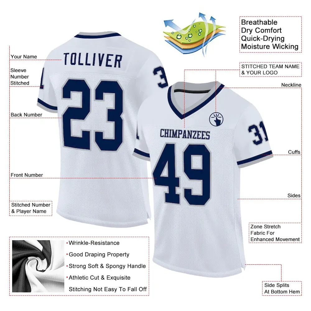 Custom White Navy-Gray Mesh Authentic Throwback Football Jersey